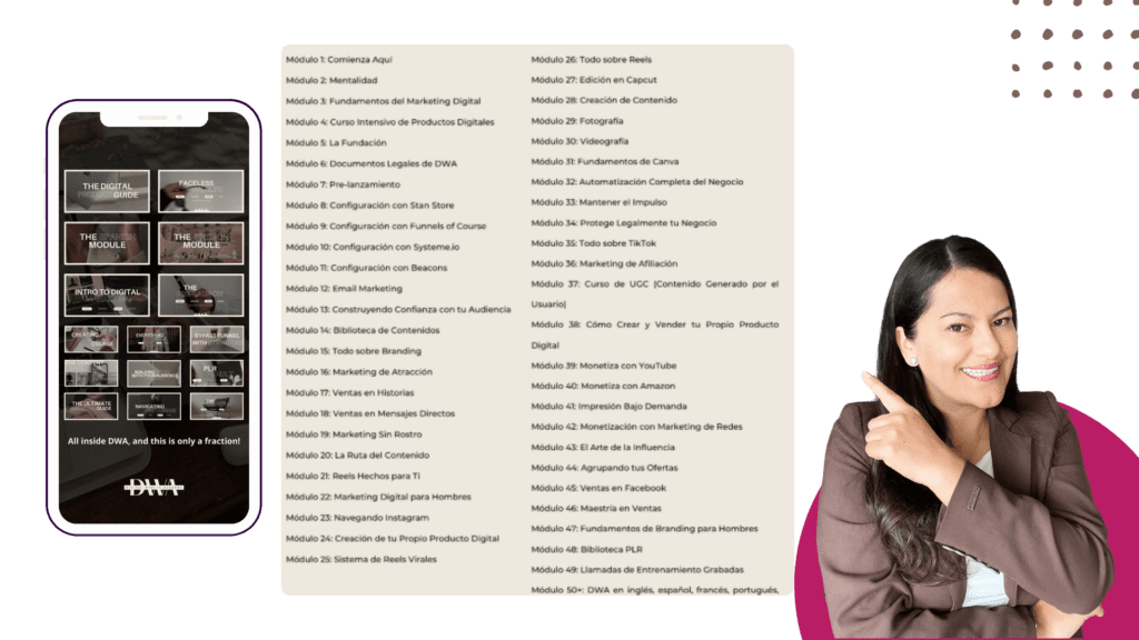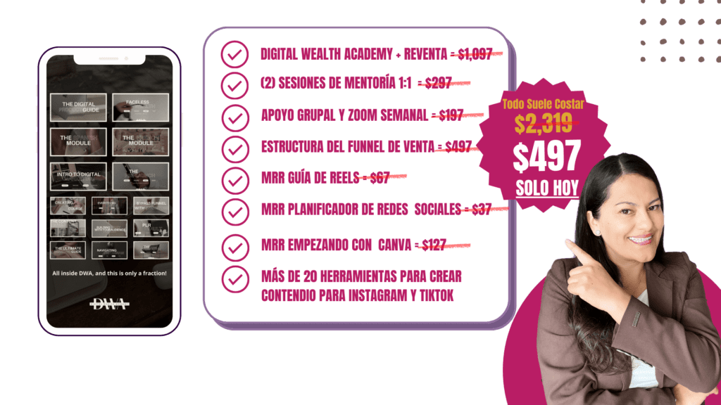 Es un curso de marketing integral ideal para principiantes (incluso sin experiencia) que desean iniciar un negocio de marketing digital exitoso. El curso incluye más de 100 módulos paso a paso que lo guiarán en el lanzamiento de su negocio de productos digitales y cómo utilizar el marketing digital para realizar ventas. Aprenderá cómo promocionarse, crear múltiples flujos de ingresos, configurar embudos de ingresos automatizados y hacer publicidad en varios canales de redes sociales, y todo lo que necesita para crear un negocio en línea rentable. Este producto es único porque una vez que lo compras, tienes el 100% de derecho de reventa y monetización de afiliado. Esto significa que puedes vender el curso y obtener un beneficio del 85%. Todas las actualizaciones futuras de DWA son gratuitas y los nuevos módulos se actualizan periódicamente.