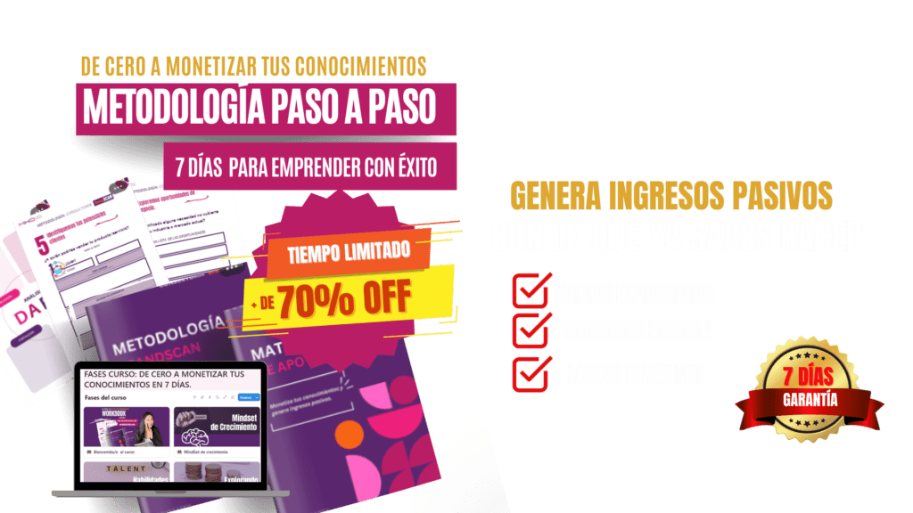 La Metodología BrandScan es tu guía paso a paso para identificar tus habilidades y conocimientos ocultos. Aprenderás a definir tu servicio o producto de manera clara y efectiva. ¡Es hora de monetizar lo que sabes para generar ingresos pasivos.